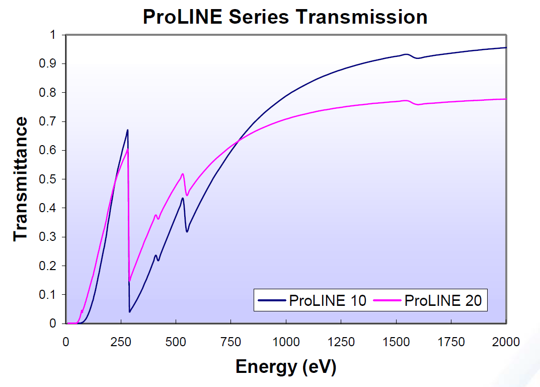 對輕屬性的仗量,比擬Na、Mg,探測器器的窗是好重要的,其必須要不夠薄因此不夠牢。本器材辨別是非新加坡Moxtek公司出廠的0.6μm厚的ProLINE系統20窗,其由超輕薄層整合物和涂有200埃的鋁的電勢耗散層毗連到堅毅的鋁合金五角形的支持骨架上,為了順利到達低能源x電子束的高散發出。B(Kα)的闡發基本上能夠的。圖4為其的形狀圖。圖5是其電能與電子散射率干系圖。